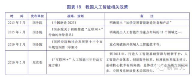 产业政策环境方面,《中国人工智能产业发展报告》梳理了中、美、日、韩四国政府从2013年到2016年出台的人工智能相关政策。例如,在中国,2016年5月发改委发布了《“互联网+”人工智能三年行动实施方案》,方案指出,到2018年,打造人工智能基础资源与创新平台,人工智能产业体系、创新服务体系、标准化体系基本建立,基础核心技术有所突破,总体技术和产业发展与国际同步,应用及系统级技术局部领先。
